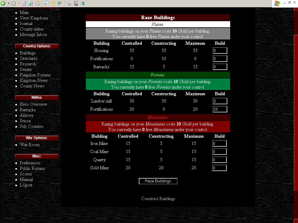 The raze buildings page is similar to the construct buildings page. Except for gold, it does not cost any resources to raze