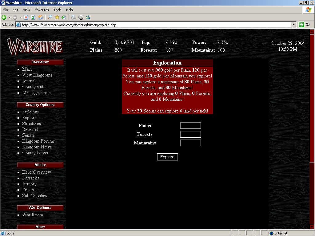 To explore, type the number of each land type you wish to explore and click the Explore button, remembering that if you