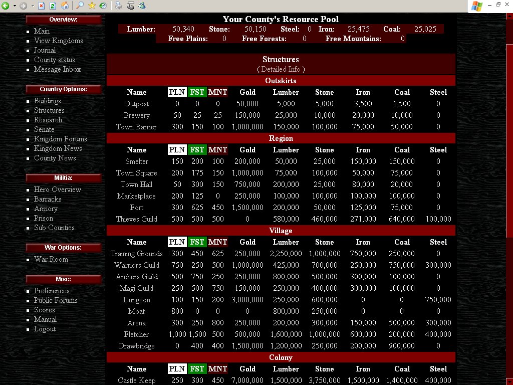 The structures page is where you create specialised buildings. Each structure offers your county different bonuses, these